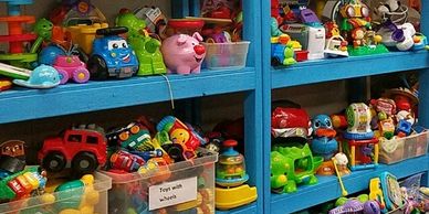 Our well-stocked toy area is a favorite stop when children come with their parents!